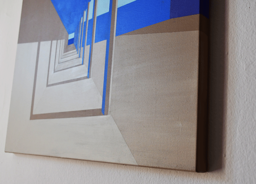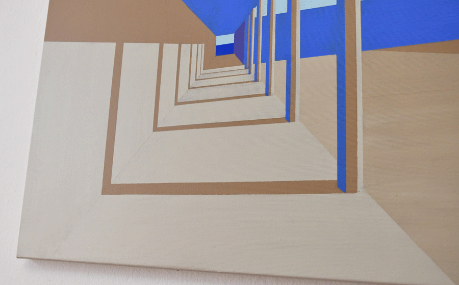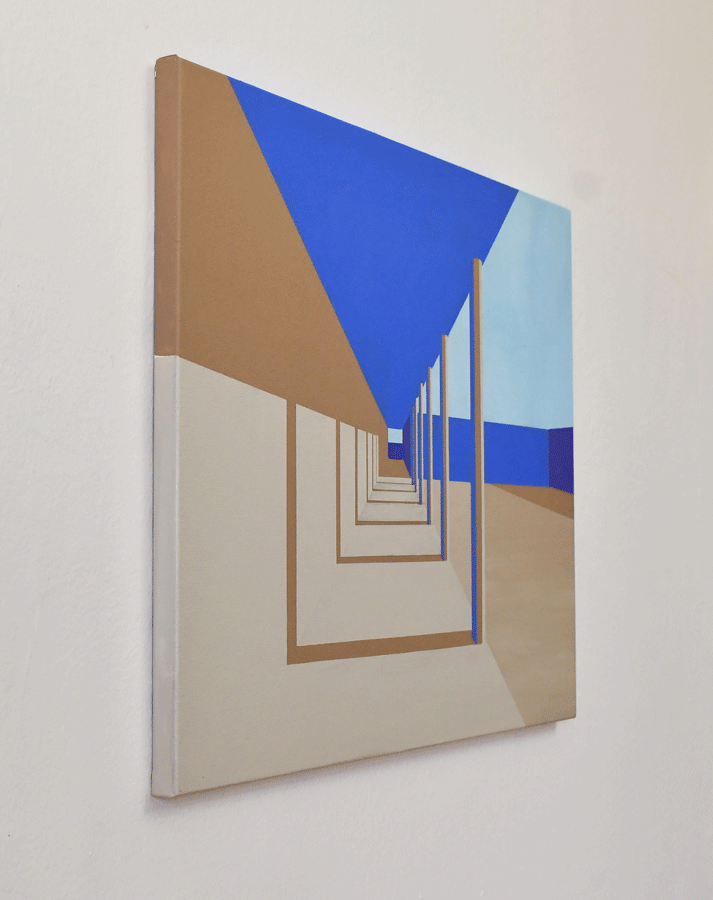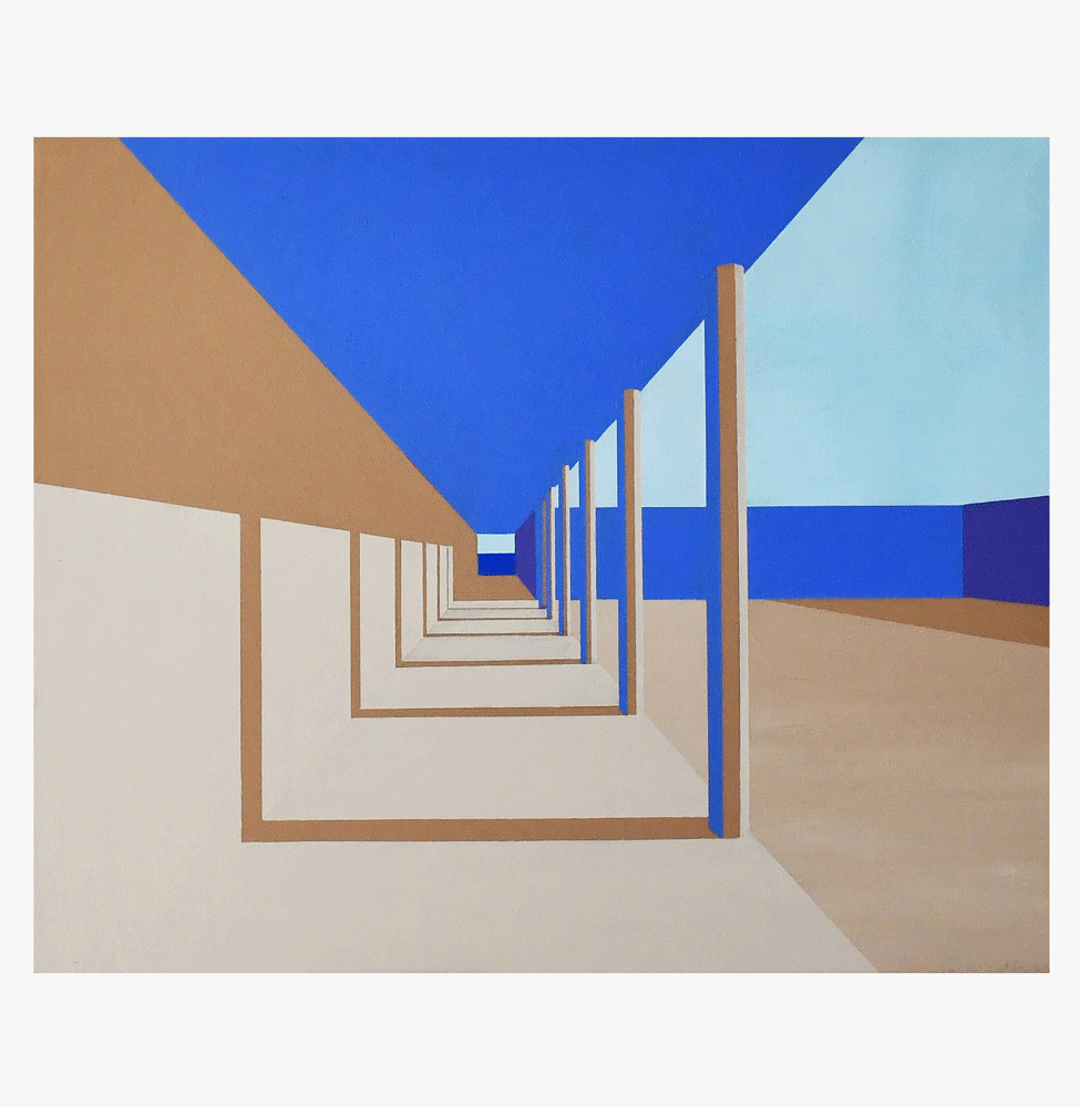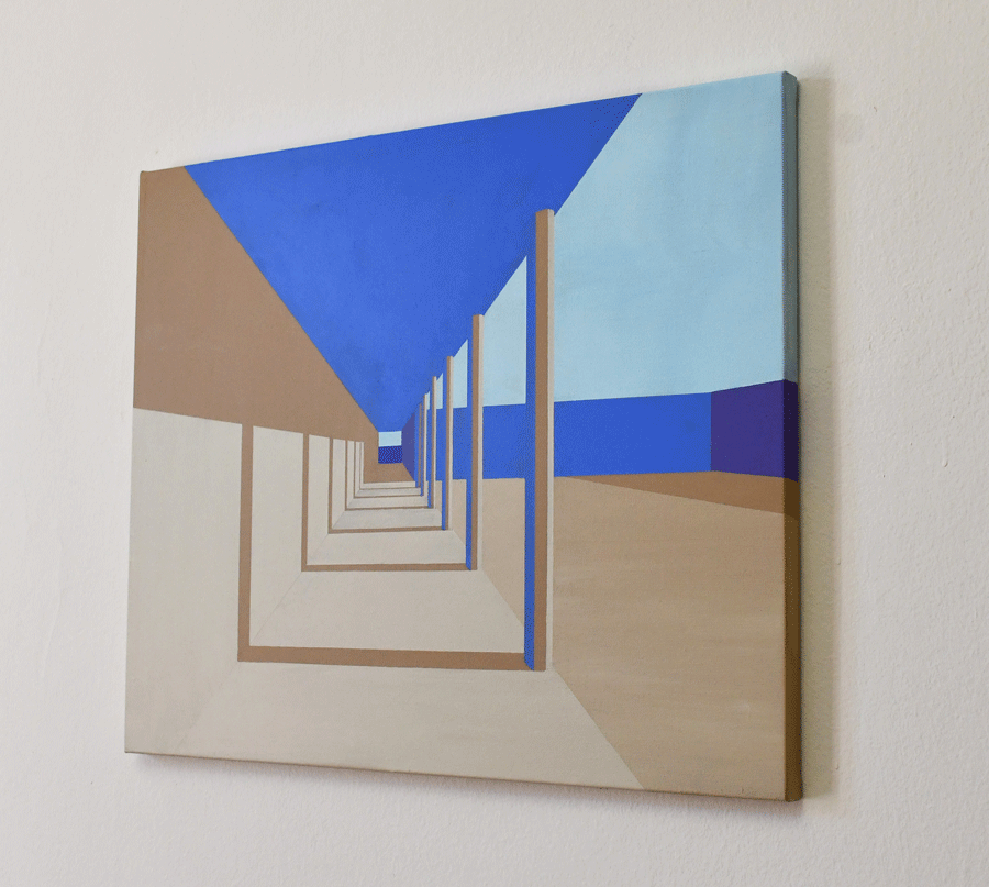 Escape into the wisdom of history is a painting of an imaginary space in ancient times, which was also inspired by Stoic philosophy. It is a philosophy that remains timeless and can be applied even today, when technology is taking the lead.