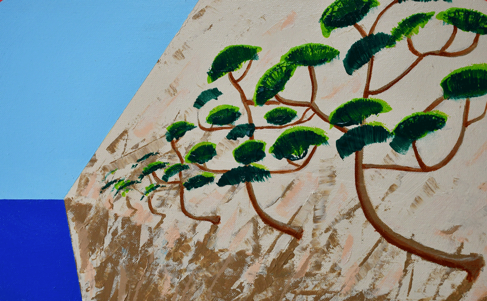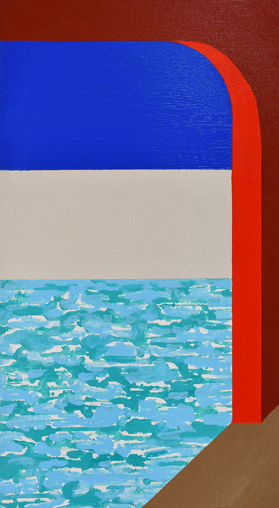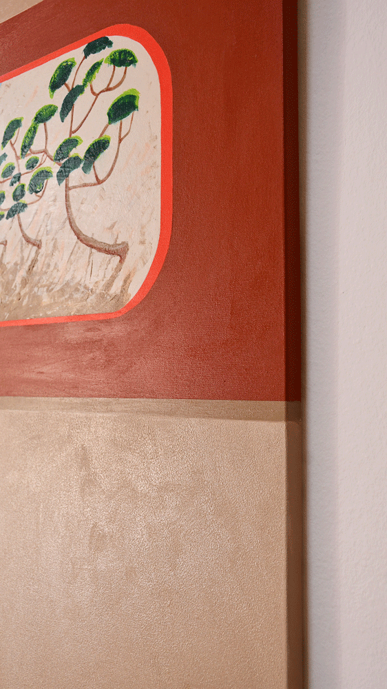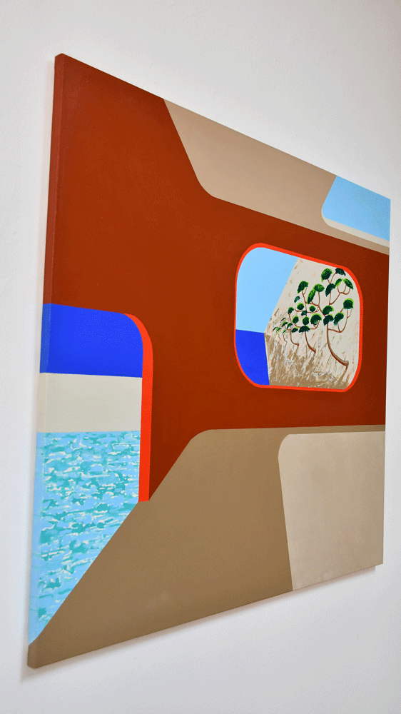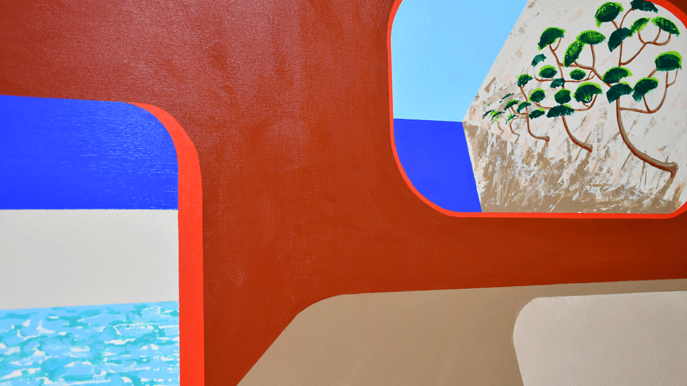 Escape X is an architectural vision on canvas, presenting a calming space where architecture and nature are in harmony. The walls are painted with red ochre, which is a natural earth pigment. The wall curves are in connection with the trees and organic shapes in nature.